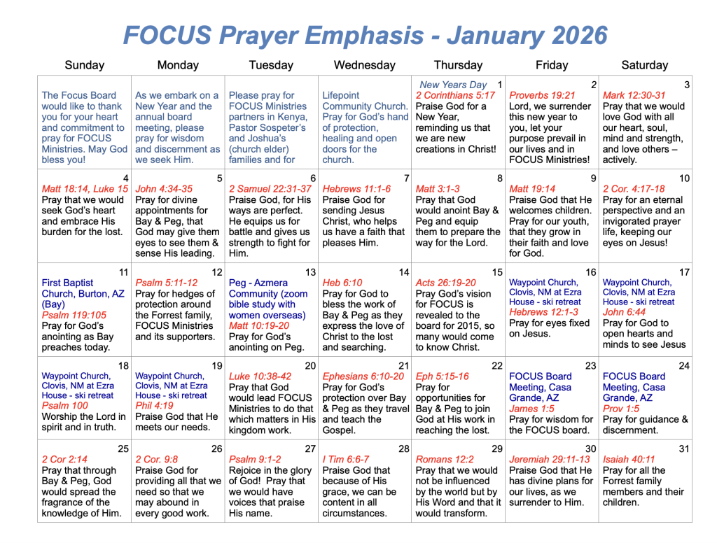 There are several ways that you can personally get involved in FOCUS Ministries. One of those ways is through prayer. We value your prayers, and are always looking to expand our Prayer Team. Each month, we will post a prayer calendar that will give you guided prayer suggestions, as well as keep you informed as to the dates we’re away speaking. As the Apostle Paul asked his ministry team to pray, so we ask the same: “pray for us, that the word of the Lord may speed ahead and be honored…(2 Thessalonians 3:1)”